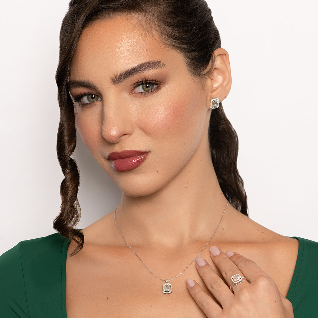 Get the bold look of a spectacular 1.5-carat diamond with the Mirage 1.5 Ct Look Emerald Cut Diamond Pendant. Meticulously crafted in luminous 18K white gold, this elegant piece showcases the signature "mirage" setting, where a brilliant cluster of natural baguette and round diamonds creates the stunning illusion of a much larger single stone. This clever design offers breathtaking sparkle and classic elegance, providing incredible value without compromise.