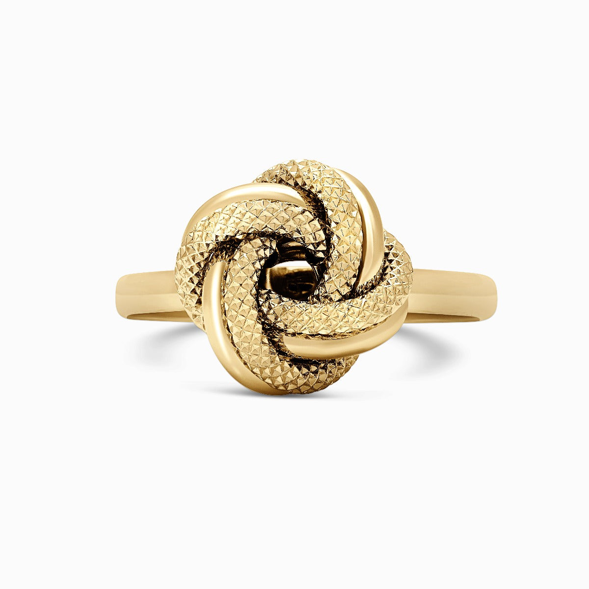 This masterfully crafted ring features a perfectly formed knot silhouette at its center, with a finely textured finish that provides a soft, subtle gleam. The rest of the luminous 18K yellow gold band is kept smooth and polished, creating a beautiful contrast that is both refined and eye-catching.