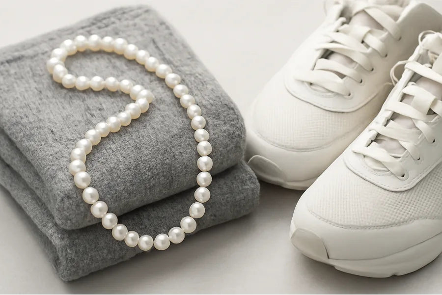 Always remove Pearls before exercising or otherwise getting sweaty. (It's not the water or the salt, but the pH of sweat is not good for them.) Be aware of the type of fabrics you wear. Fabrics like Shetland wool can damage Pearls. Never leave your pearls around a direct source of heat such as a fireplace mantle, on top of a television set, or stove.