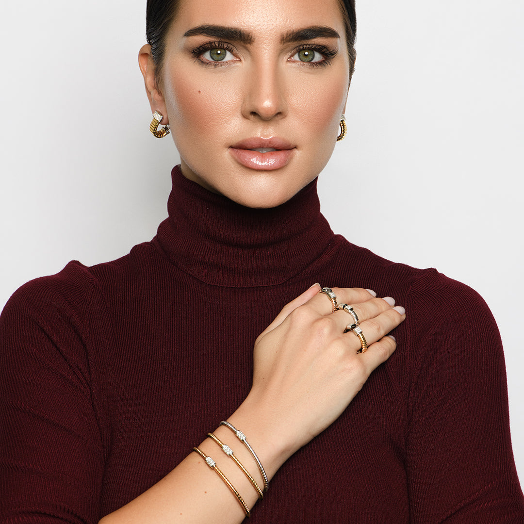 This diamond encrusted bangle in 18K Rose Gold from Tessitore is a luxurious piece using the traditional Italian Tubogas jewellery making process creating modern and ethnic designs.