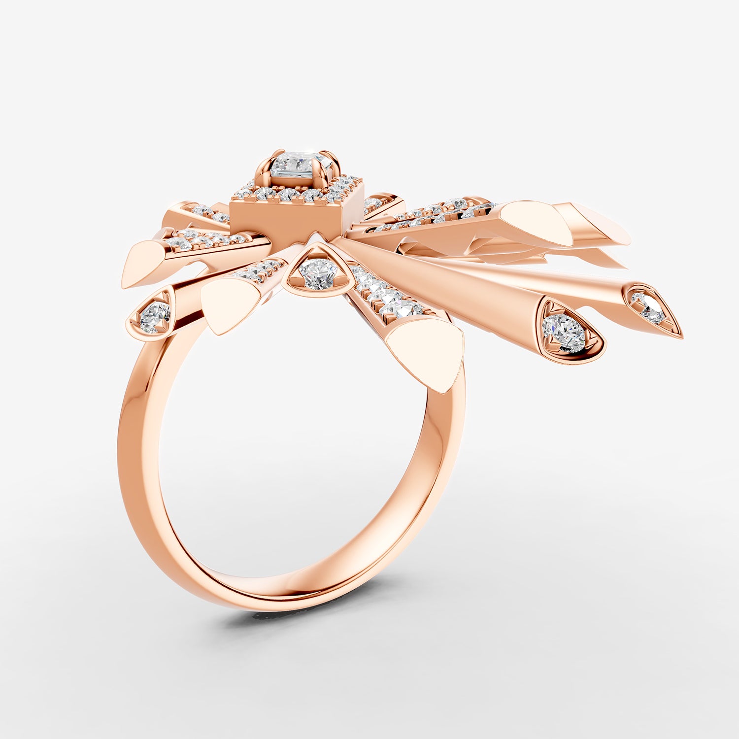 The ring's captivating open-ended design features two distinct starburst motifs, one larger and one smaller, positioned gracefully at each end of the band. Each starburst radiates with brilliant light, beginning with a central square-cut diamond and fanning out into lines of polished 18K rose gold and meticulously pavé-set diamonds. This unique design creates a sense of fluid motion and effortless elegance, allowing it to sit beautifully on the finger.