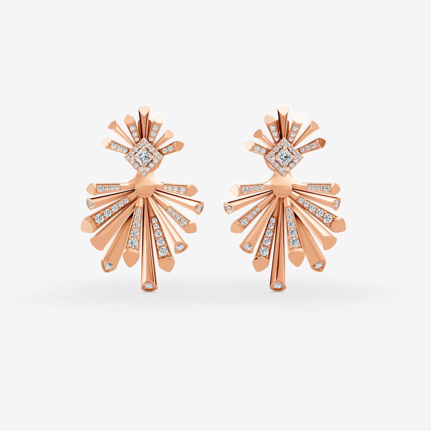 Each earring features a sophisticated two-part design, crafted from lustrous 18K rose gold. At the top, a striking square-cut diamond acts as the core of a delicate starburst, with radiating lines of polished gold and shimmering pavé-set diamonds. This motif is gracefully connected to a larger, inverted starburst at the bottom, creating a beautiful and articulated cascade of light.