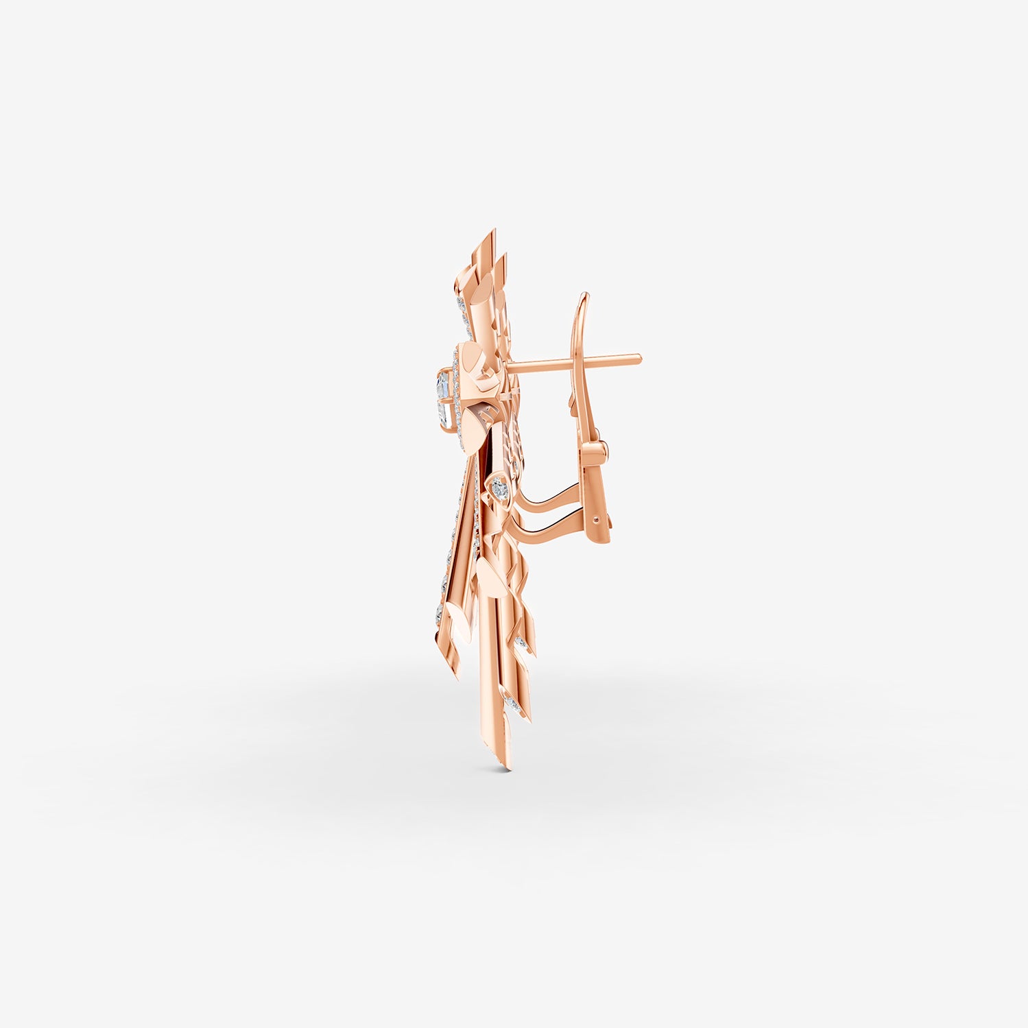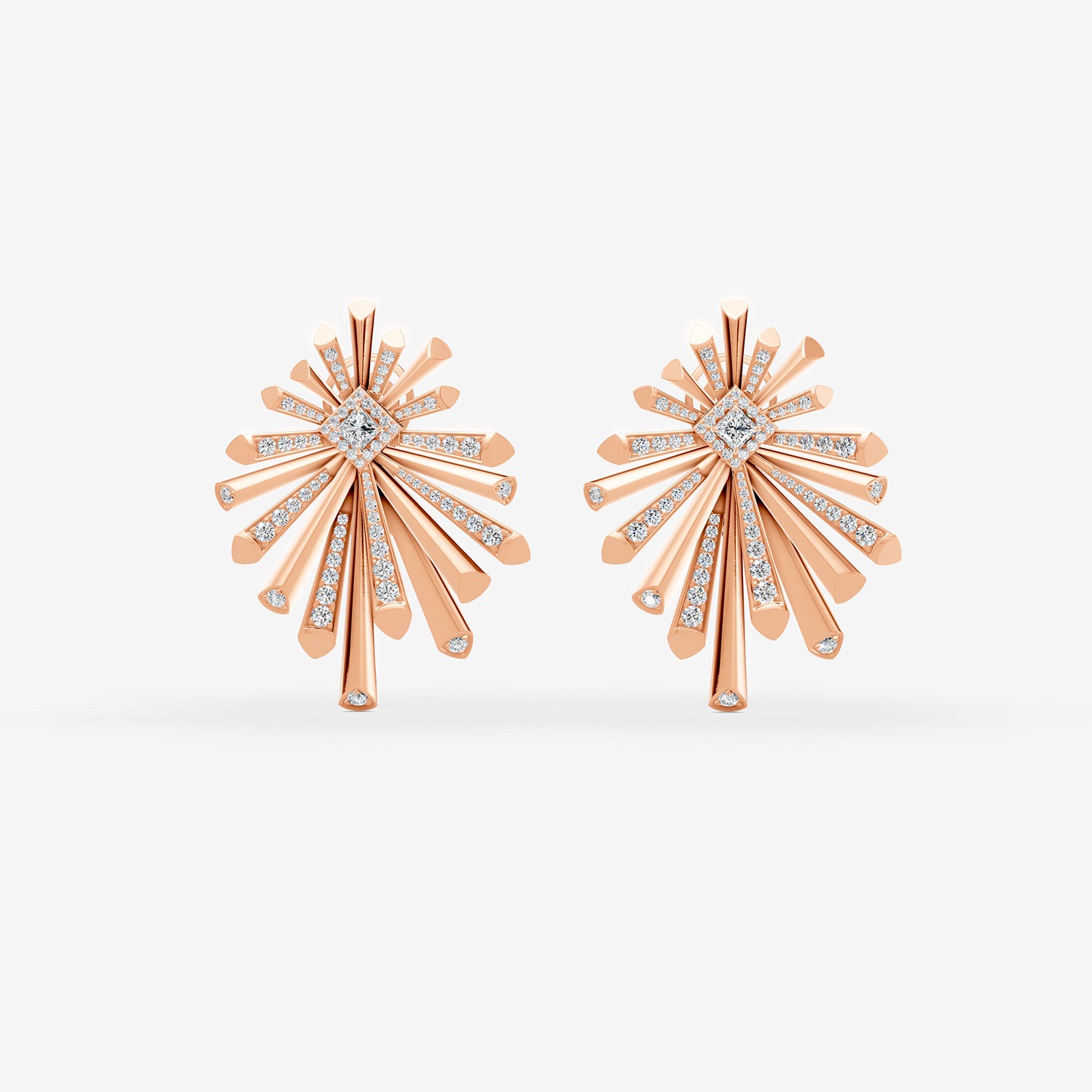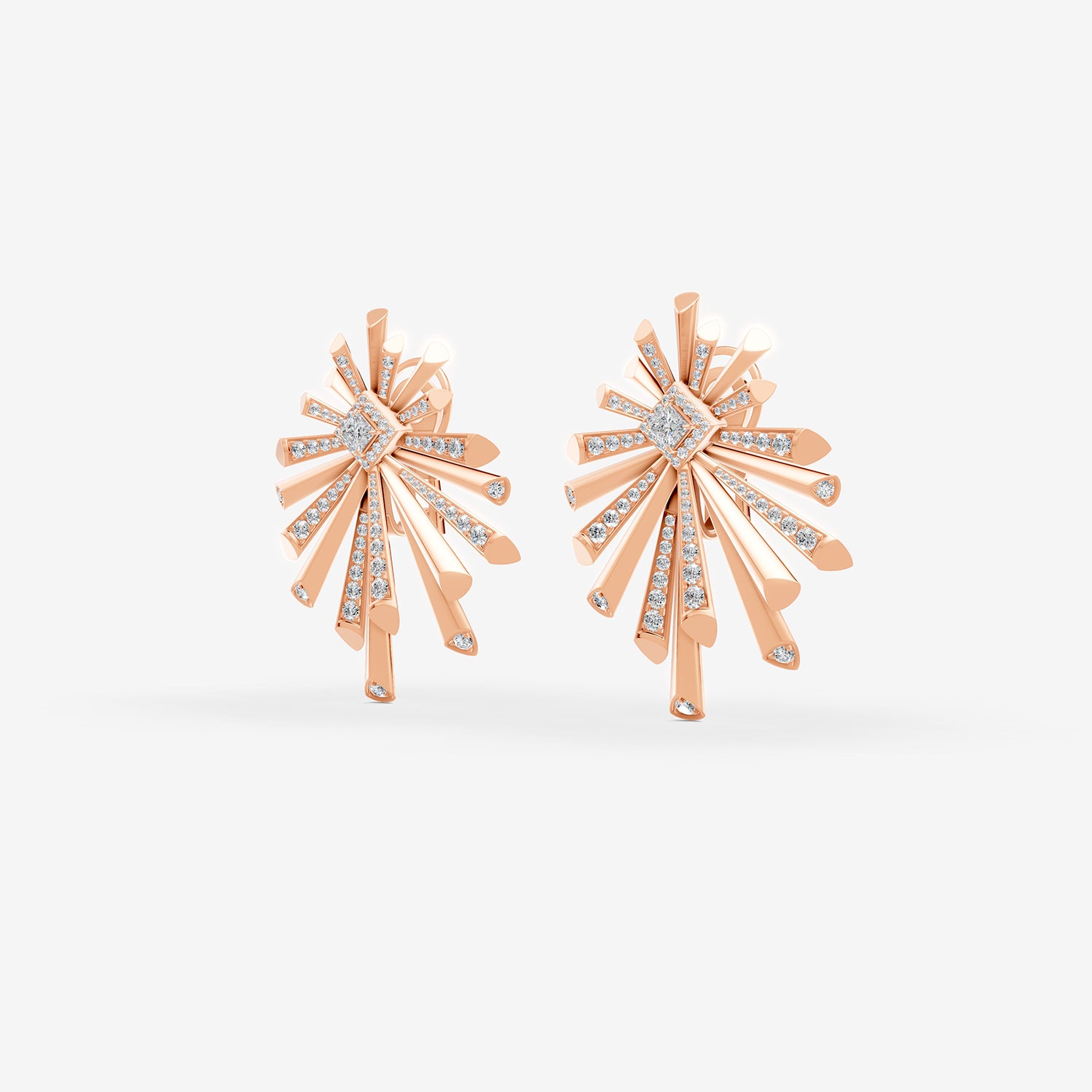 Each earring features a sophisticated two-part design, crafted from lustrous 18K rose gold. At the top, a striking square-cut diamond acts as the core of a delicate starburst, with radiating lines of polished gold and shimmering pavé-set diamonds. This motif is gracefully connected to a larger, more substantial inverted starburst at the bottom, creating a beautiful and articulated cascade of light.
