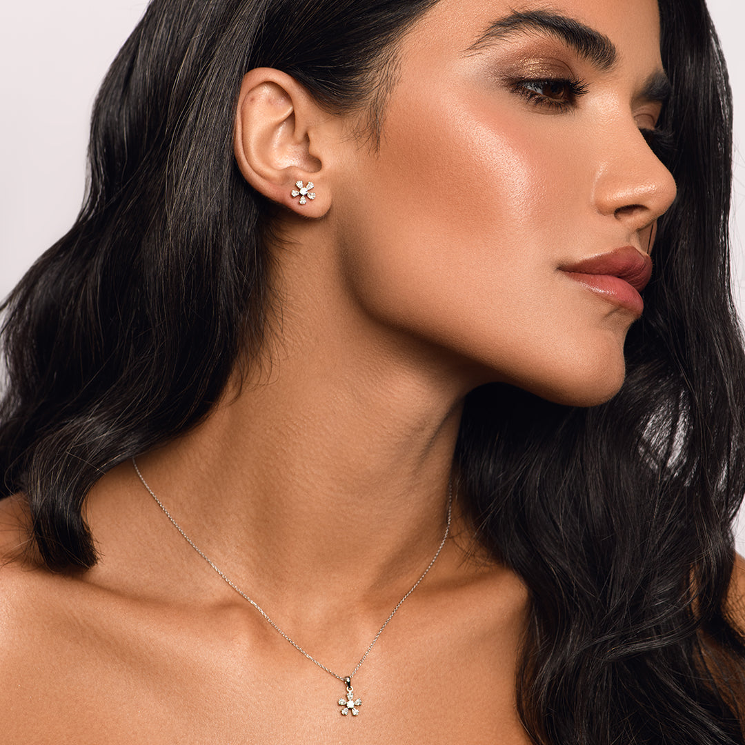 The Red Carpet 5 Petals Flower Diamond Earring is a magnificent masterpiece that captures the essence of sophisticated glamour and timeless elegance. This exquisite pair of stud earrings is meticulously crafted in polished white gold, serving as a brilliant canvas for a breathtaking floral arrangement. The design showcases a graceful flower, with each of its five petals masterfully formed by a stunning pear-shaped diamond, all radiating outward from a sparkling central stone.