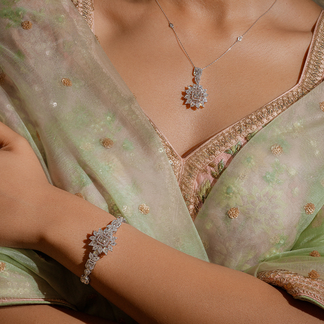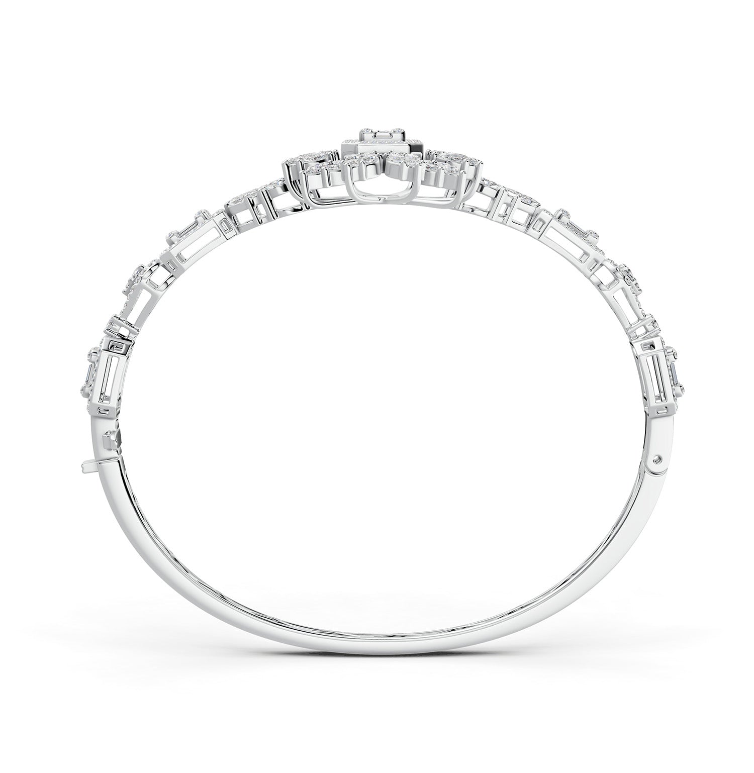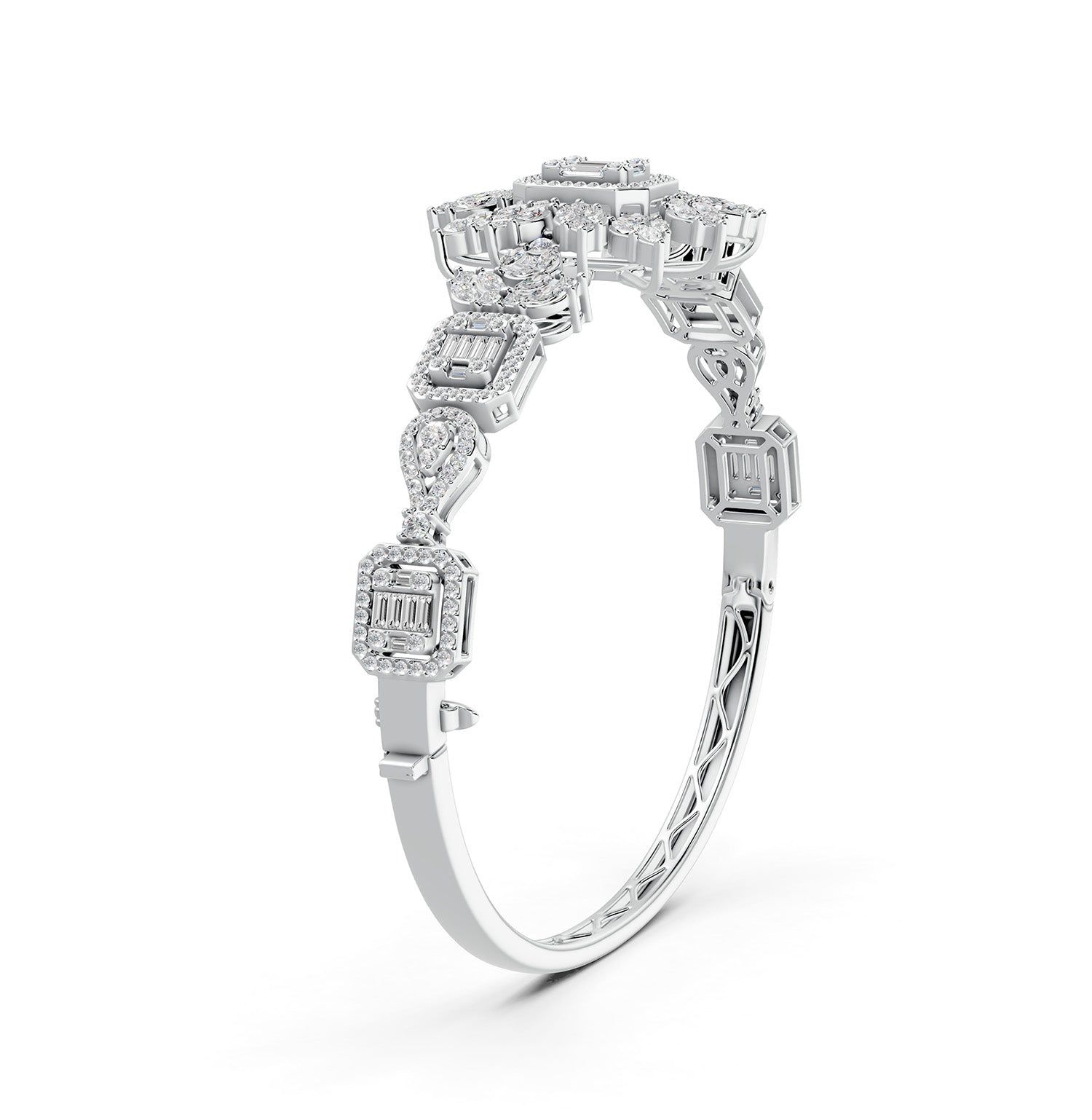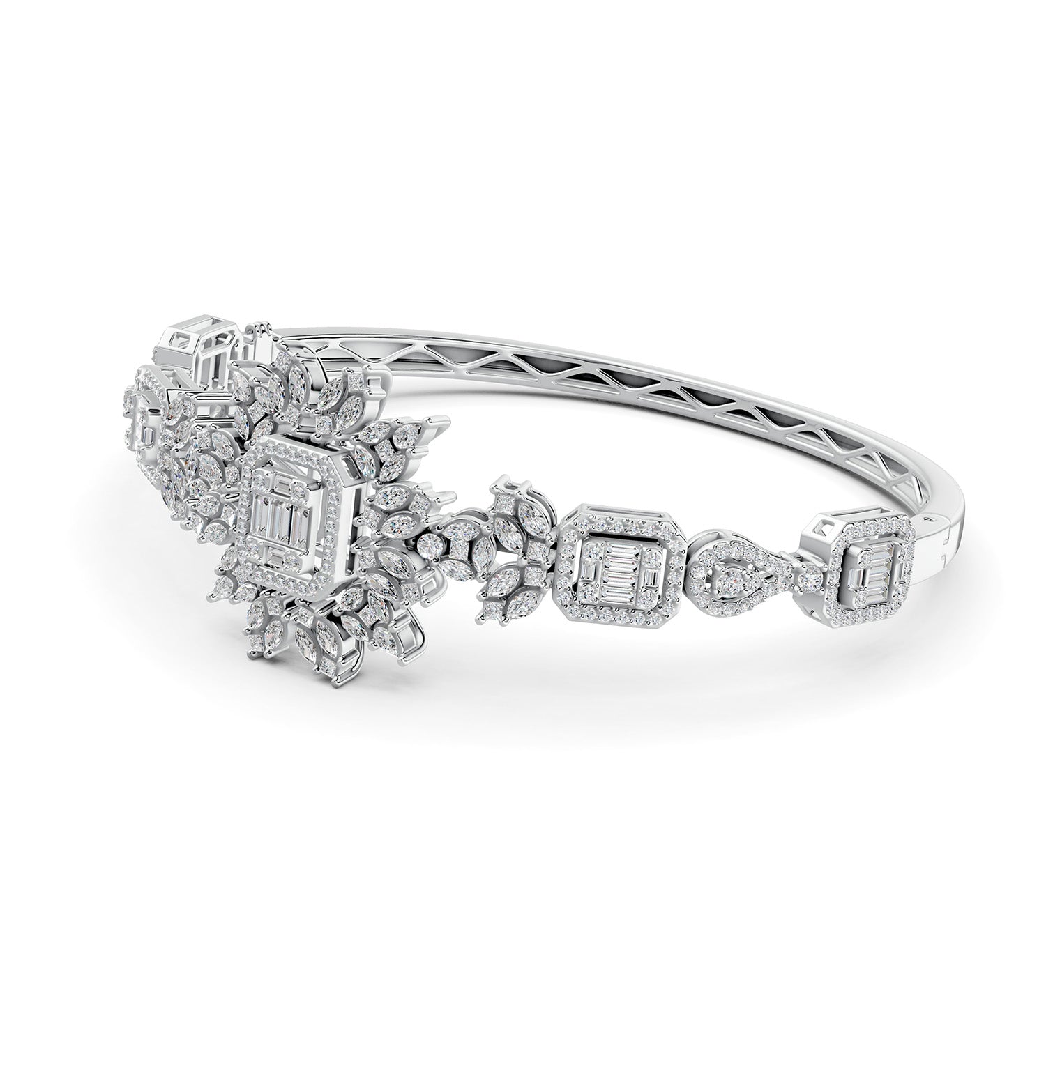 This magnificent diamond bangle from our Red Carpet collection is a tribute to nature. Natural diamonds in baguettes and rounds are handcrafted and set in 18 Karat White Gold to create this exclusive, one-of-a-kind piece of jewellery. Get this celebrated piece that makes a bold statement!