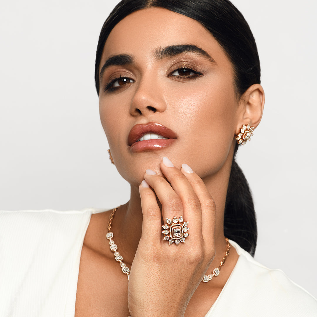 The Red Carpet Rose Gold Diamond Sunburst Ring - Large is a magnificent showstopper, radiating with the warm glow of rose gold and brilliant diamonds. This exquisite ring is a true masterpiece from our Red Carpet Collection, featuring a spectacular sunburst design that emanates outward from a dazzling center. The intricate craftsmanship captures the essence of a celestial event, creating a powerful and glamorous statement piece.